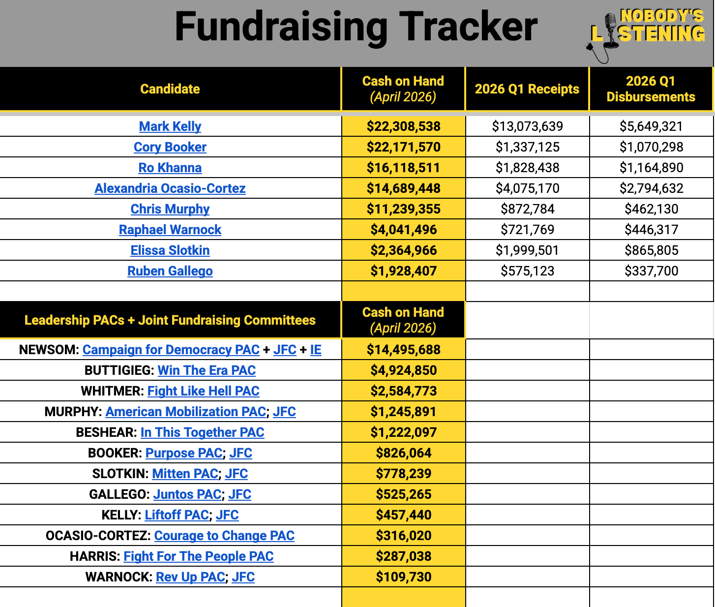 But since yesterday marked the first quarterly FEC deadline of 2026, naturally, I spent most of the last 24 hours combing through the newly filed reports so I could provide the true sickos with rapid, in-depth analysis of the 2028ers’ Q1 activities. So the mediocre jokes and lukewarm takes will have to wait until next week. (Or just tune in to me and Rob’s new politics show this afternoon, which promises to be unhinged.)